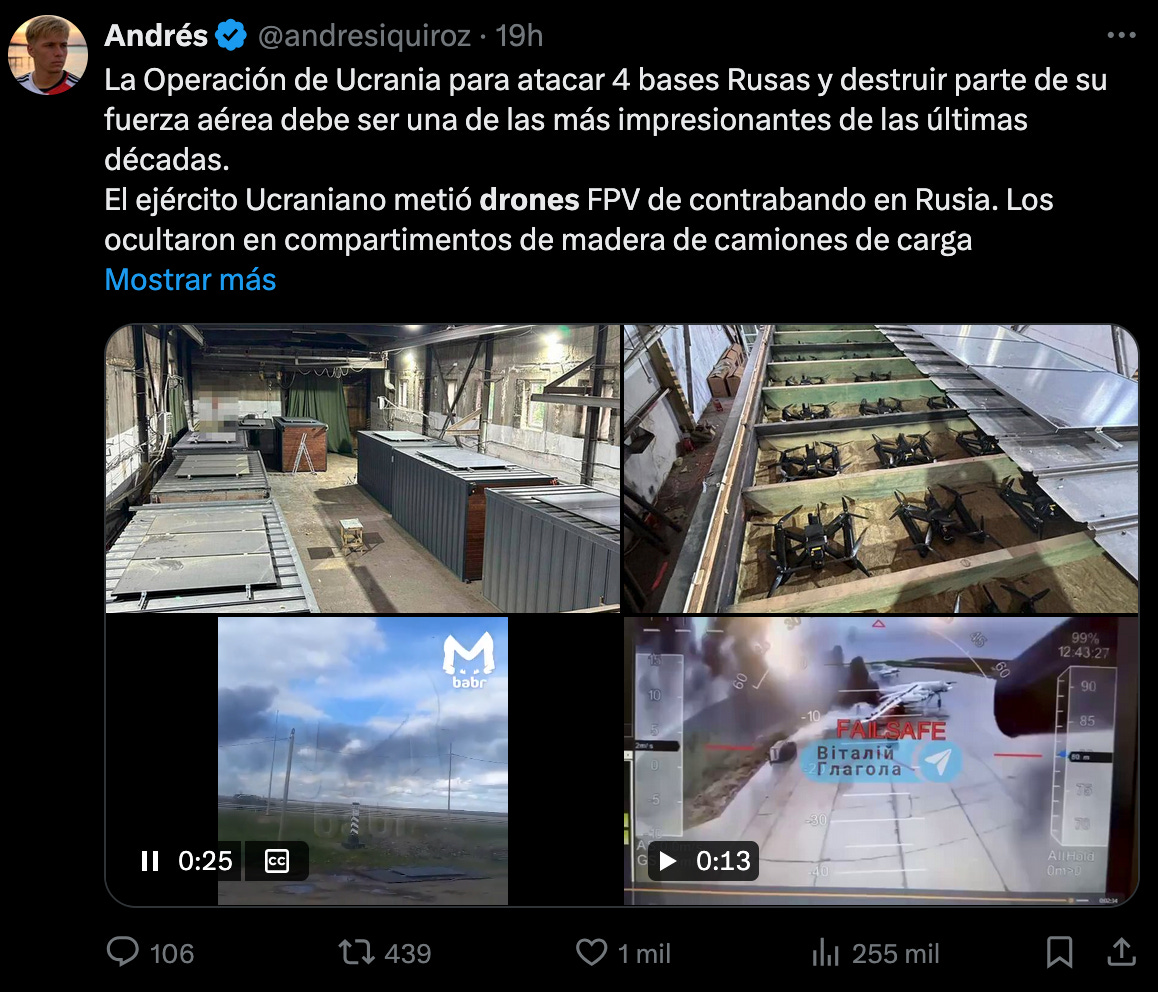 Europa se ha visto sorprendida tras el reciente ataque ucraniano a una base rusa de aviones de combate, logrando destruir decenas de aviones de combate gracias a drones escondidos en camiones en la llamada operación ‘Tela de araña’. En redes, muchos usuarios han señalado lo sorprendente que ha sido la destrucción lograda por el bando ucraniano con el uso de simples drones.