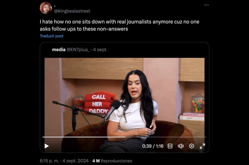 El otro día me topé con un tuit que recogía un fragmento de un pódcast en el que una chica (no tengo ni idea de quién es esta influencer o creadora de contenido) entrevistaba a Katy Perry. El tuit venía a decir: “Odio que ya nadie se siente con periodistas de verdad porque nadie persigue a estas respuestas vacías”.