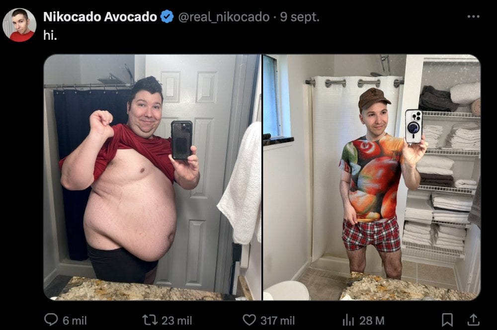 Ver el antes y el después resulta inexplicable. Muchos apuntan a ozempic. Yo no tengo ni idea. Me alegro por él, porque engañó a sus suscriptores subiendo vídeos pregrabados mientras él trabajaba ya en su bajada de peso de forma secreta durante dos meses. Me alegraría saber que ha cambiado su vida. Pero es que no me lo creo.