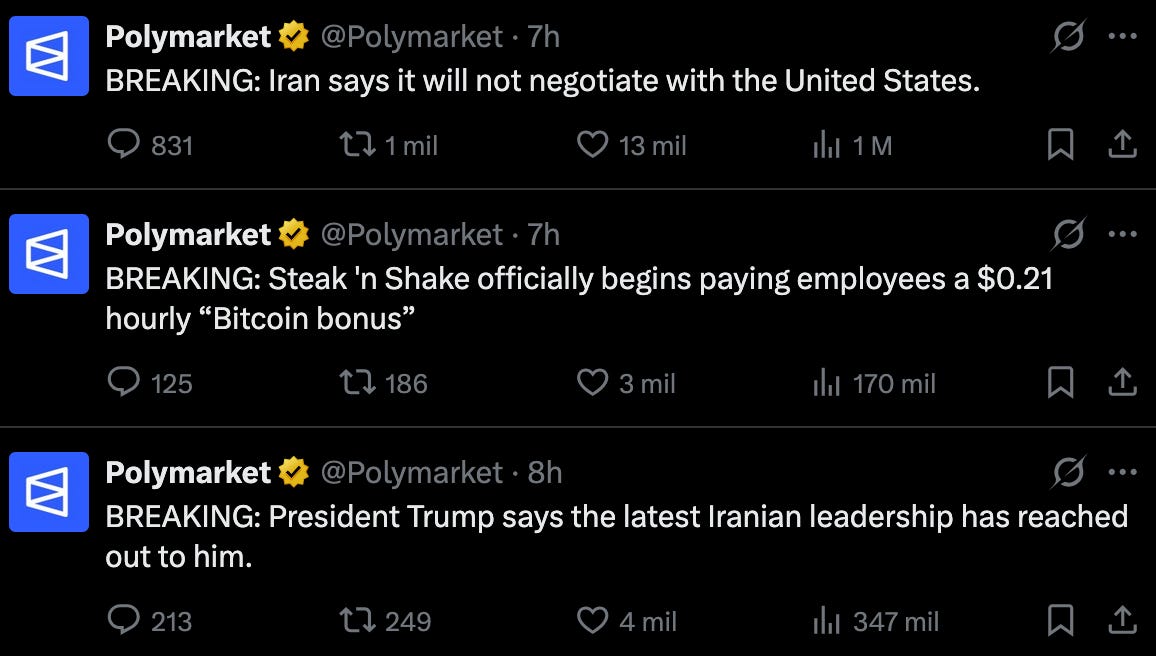 De hecho, la cuenta de Polymarket en Twitter comparte noticias. Con el grito de “BREAKING:”, Polymarket comparte titulares sobre eventos de actualidad, adoptando así el papel de un medio de comunicación.