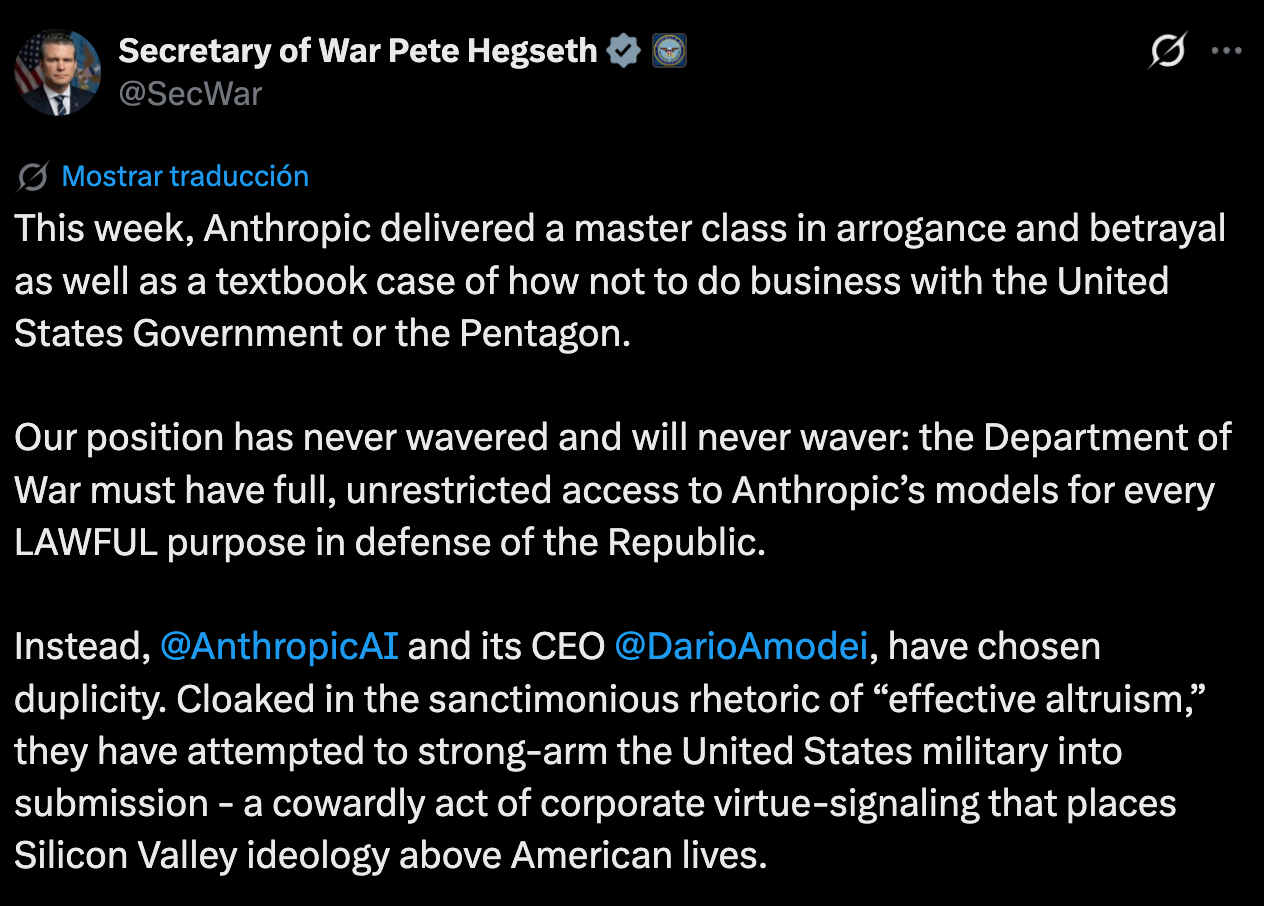 En cambio, Anthropic y su director ejecutivo, Dario Amodei, han optado por la duplicidad. Amparados en la retórica santurrona del “altruismo efectivo”, han intentado someter a las fuerzas armadas estadounidenses mediante la presión, un acto cobarde de presunción corporativa que antepone la ideología de Silicon Valley a la vida de los estadounidenses”.