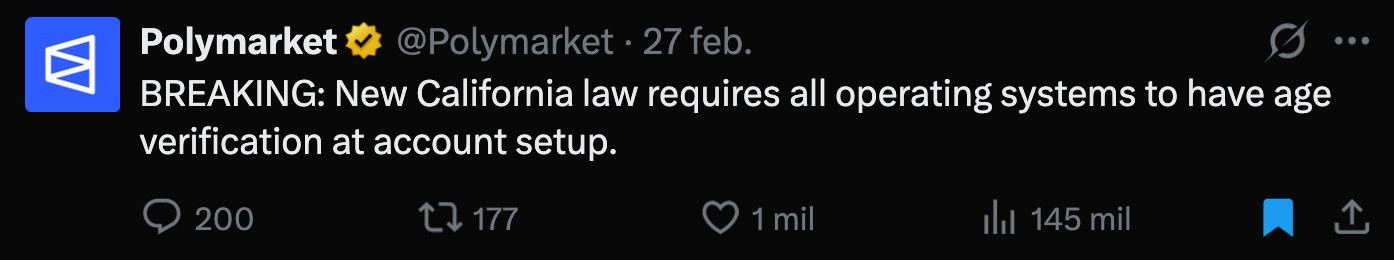 “A new California law says all operating systems, including Linux, need to have some form of age verification at account setup”. https://www.pcgamer.com/software/operating-systems/a-new-california-law-says-all-operating-systems-including-linux-need-to-have-some-form-of-age-verification-at-account-setup/
