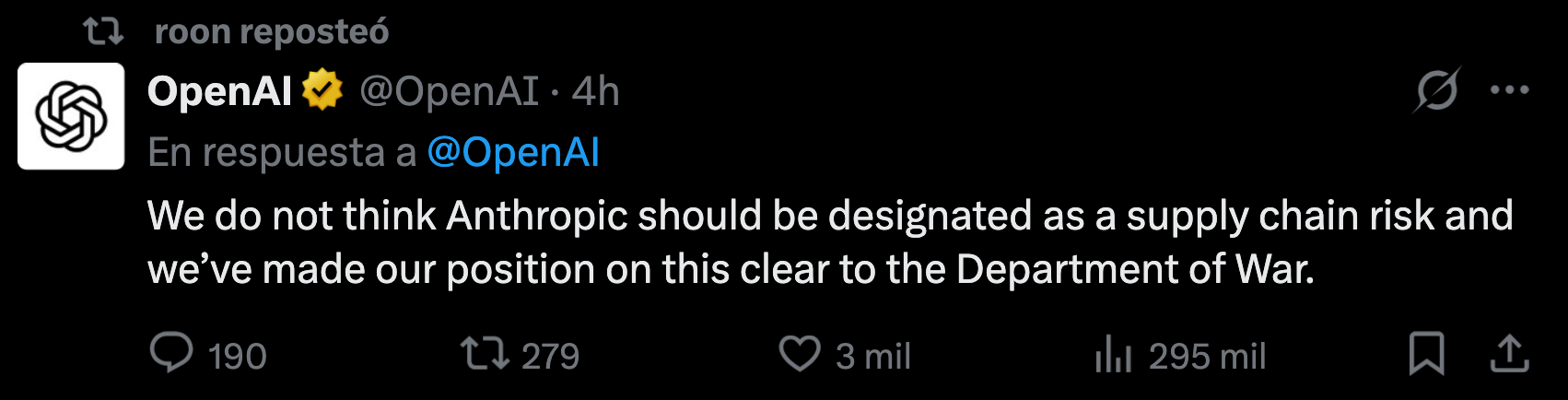 Este domingo, la cuenta oficial de OpenAI en X publicó un tuit en apoyo a Anthropic, señalando que no creen adecuado designarles como riesgo para la seguridad nacional.
