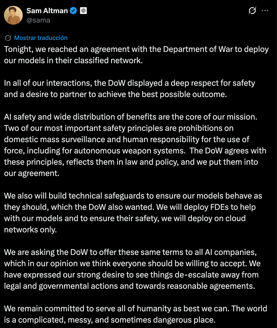 En primer lugar, algo muy importante que cambia para siempre la manera en la que entendemos el papel de la inteligencia artificial en nuestras sociedades. Sam Altman, CEO de OpenAI (ChatGPT) anunció en X el 28 de febrero que habían alcanzado un acuerdo con el Ministerio de Defensa estadounidense para cederles su tecnología de inteligencia artificial para sus usos confidenciales.