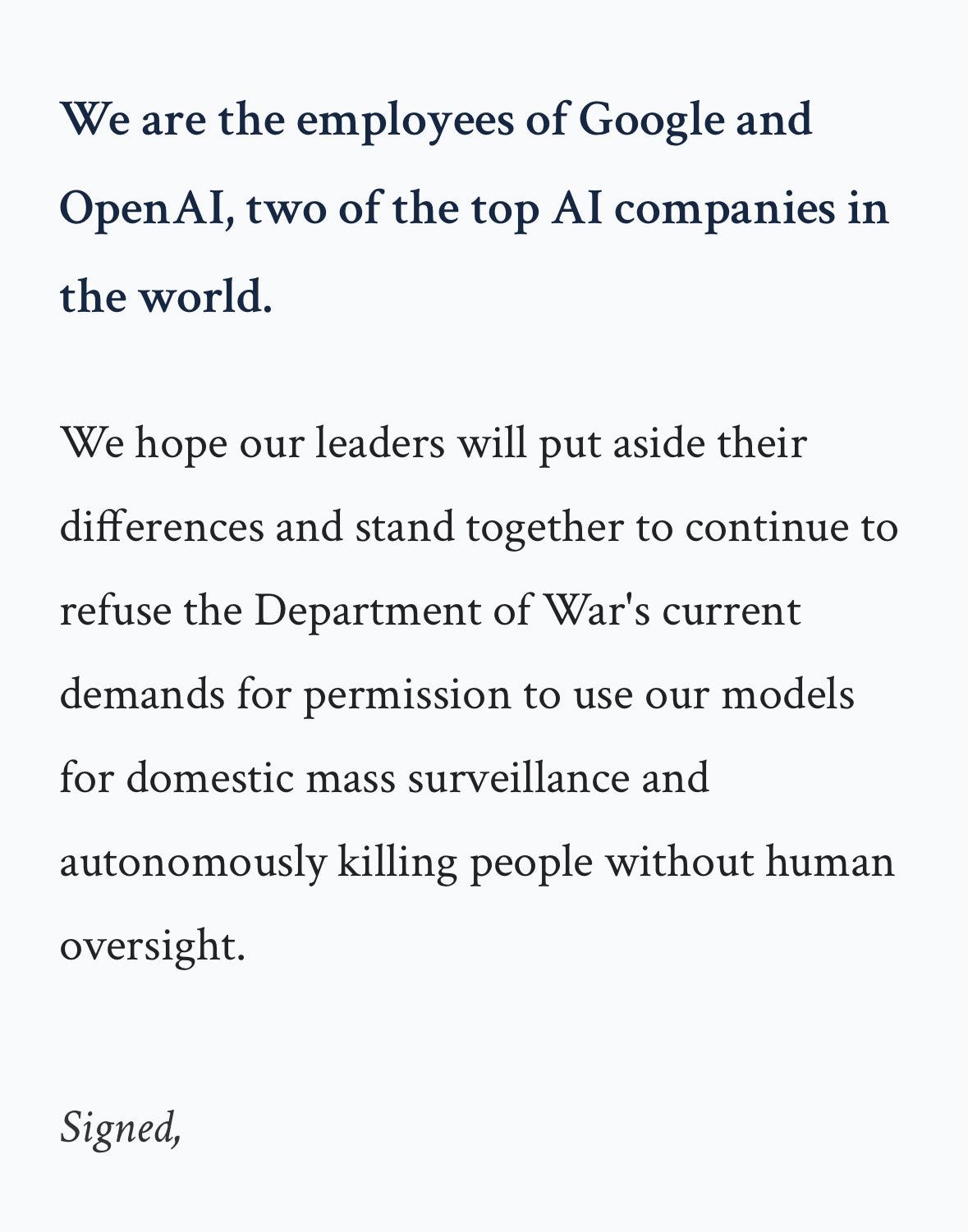 Esperamos que nuestros líderes dejen de lado sus diferencias y se mantengan unidos para seguir rechazando las exigencias actuales del Departamento de Guerra de permitir el uso de nuestros modelos para la vigilancia masiva nacional y el asesinato autónomo de personas sin supervisión humana”.