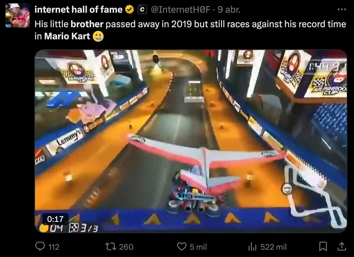 Todos hemos visto ese vídeo viral en redes sociales en el que una persona supuestamente juega una partida de Mario Kart en la que compite contra el fantasma de su hermano fallecido para sentirse un poco cerca de él (fantasma literal y metafórico: así se le llamaba a la carrera guardada de un jugador que podía recrearse posteriormente en el juego japonés). Las dudas sobre la originalidad del vídeo no cambian el hecho de que a todos nos emociona al verlo, porque comprendemos la profunda nostalgia que, sorprendentemente, puede guardar un mundo de solo dos dimensiones.