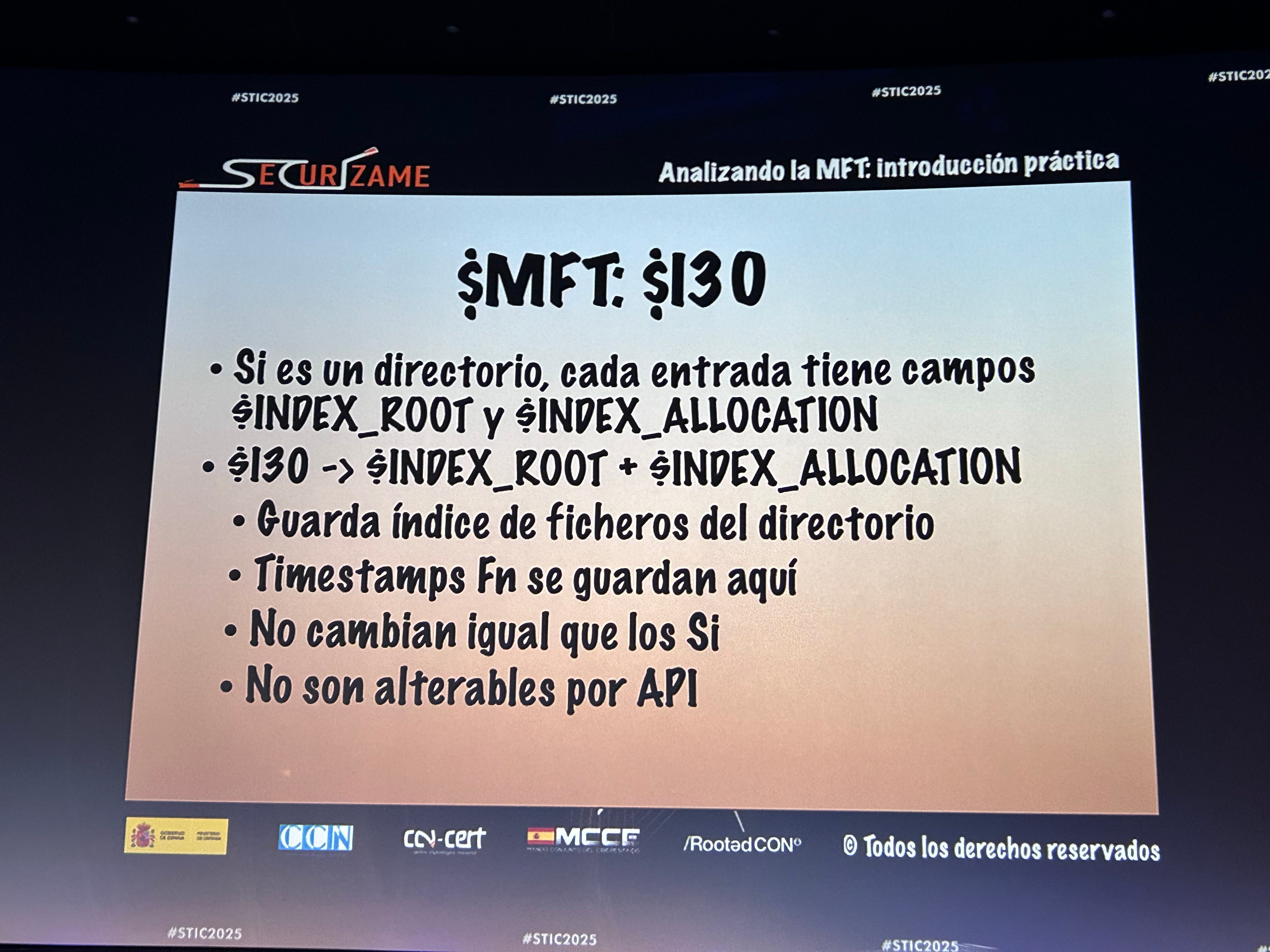 En su taller, Martínez nos explica que esta MFT que podemos encontrar, por ejemplo, en un sistema operativo Windows (no así en macOS o Linux ya que estos SO usan otros sistemas de ficheros), es un recurso esencial a tener en cuenta a la hora de realizar el análisis de un incidente de seguridad informática.