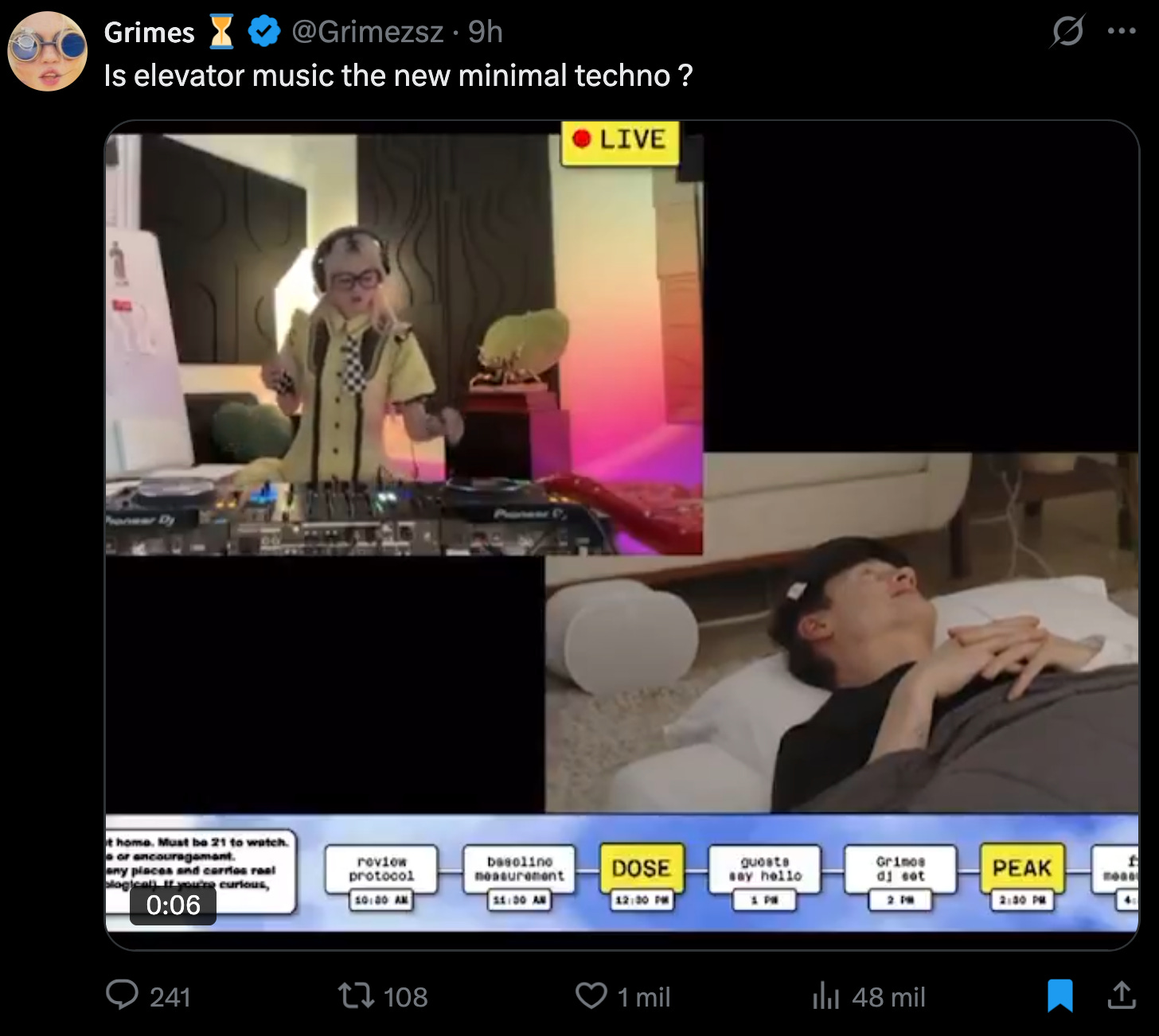 La incursión de Grimes en la élite ideológica criptopunk es total. Hace poco la vimos pinchando música de ascensor en un DJ set que le ponía banda sonora al viaje de setas alucinógenas que se pegó en directo Bryan Johson (el millonario friki del antienvejecimiento que se inyecta sangre de su hijo). Aunque algunos fans se mueren del cringe, creo que podemos ver todo esto como una nueva forma de performance digital, en la que el artista juega deliberadamente con la ironía y con las percepciones que puede transmitir un post o stream en redes.