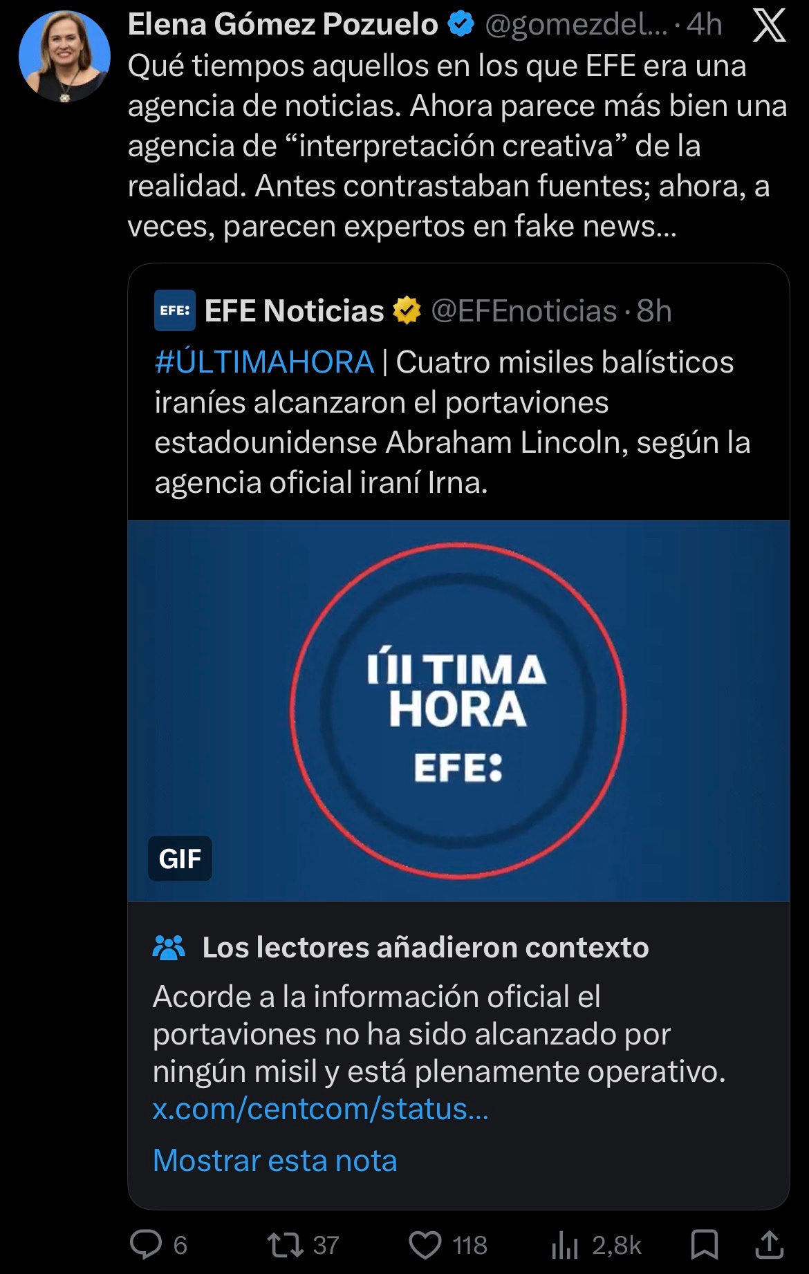Aunque se guiaron por una información en teoría fiable, una nota de la comunidad a su tuit volvió a atacar su legitimidad. Posteriormente, se vieron obligados a rectificar después de que desde la Armada estadounidense negaran los impactos: “EEUU niega que el portaviones Abraham Lincoln haya sido alcanzado por misiles iraníes”5, dice ahora la noticia.