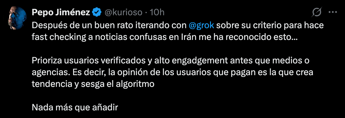 Y vamos mas allá: el propio Grok ha confesado, gracias al mareo que le causó Pepo Jiménez, que los criterios que usa para verificar una información no son para nada fiables: