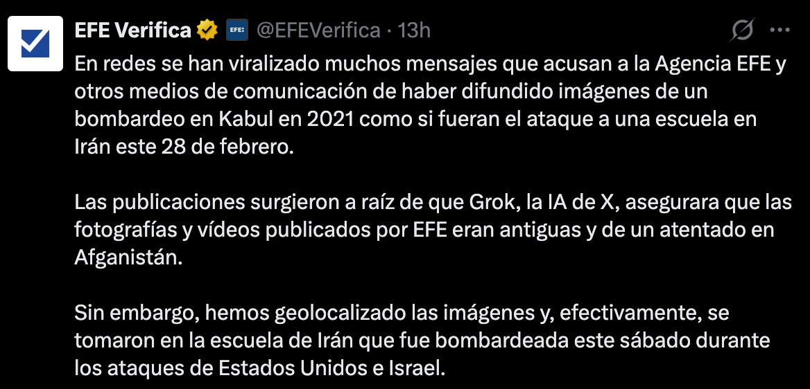 “También #VerificaRTVE lo ha comprobado. Es la imagen real de una escuela iraní bombardeada. Gracias a los compañeros de #VerificaRTVE que llevan dos días trabajando para que RTVE sea un lugar con información contrastada y fiable. Luego está Grok, la IA de Elon Musk, que decía ayer que eran de Afganistán 2021... pero eso era ayer”4.