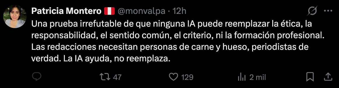 Lo acontecido este domingo en X es digno de estudio en las facultades de periodismo. En la nueva era, los medios y periodistas no solo deben enfrentarse a desinformadores, difusores de bulos e influencers radicales, sino a las propias maquinarias de inteligencia artificial que, con la característica soberbia con la que se las ha programado, no dudan en emitir cualquier juicio sobre la realidad. Aunque con ello contradigan a una de las agencias de noticias de habla hispana más importantes.