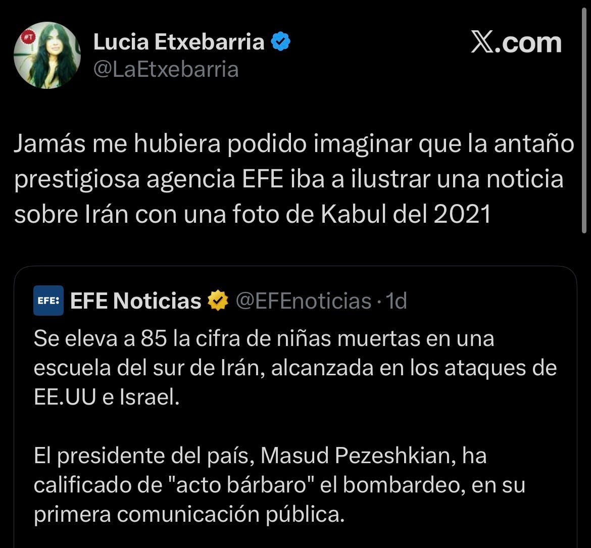 También la escritora Lucía Etxebarria, conocida por su actitud exaltada contra la izquierda española, menciona el tuit de EFE y dice: “Jamás me hubiera podido imaginar que la antaño prestigiosa agencia EFE iba a ilustrar una noticia sobre Irán con una foto de Kabul del 2021”. También la cuenta ElTrumpista, con casi 300.000 seguidores, se burla de la agencia.