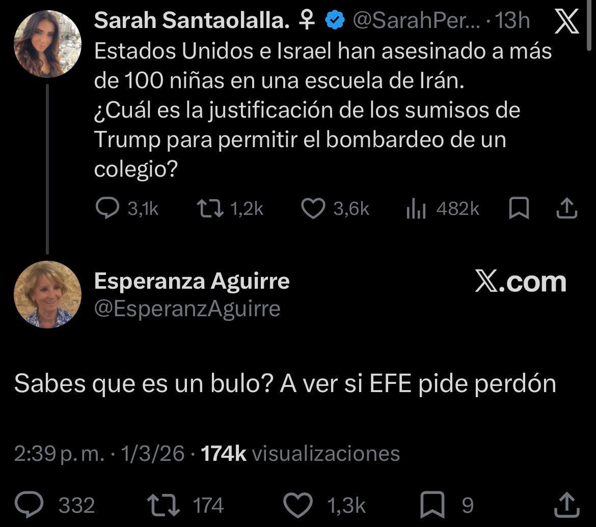Figuras como la expolítica Esperanza Aguirre (PP) se meten en la trifulca. En respuesta a una usuaria que lamentaba la muerte de estas escolares, Aguirre dice: “Sabes que es un bulo? A ver si EFE pide perdón”.
