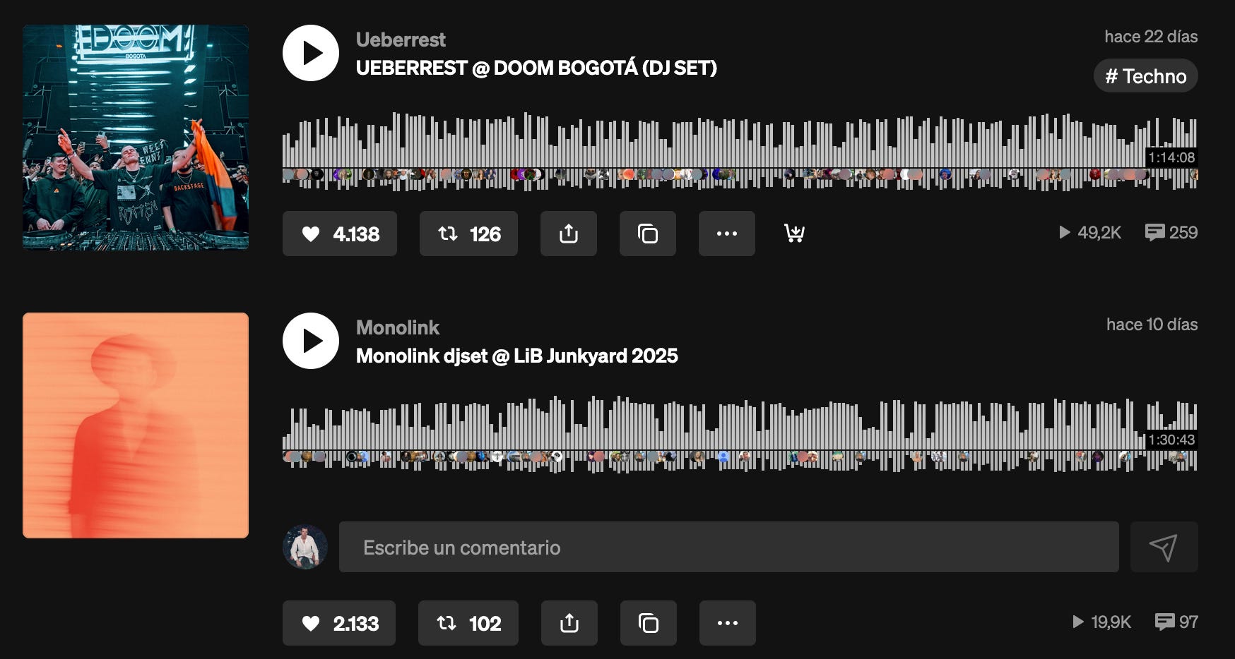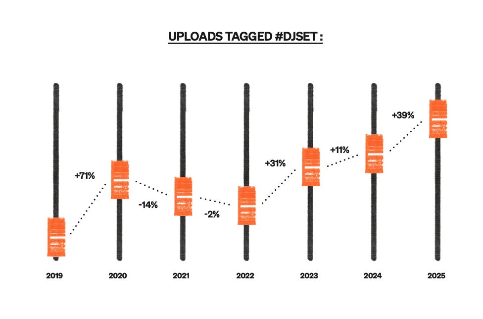 Paralelamente a la tendencia hasta ahora comentada, SoundCloud también señala que han aumentado en un 39% frente al 2024 la cantidad de pistas subidas etiquetadas como “DJSET”, es decir, pistas de larga duración correspondientes a sesiones de DJ’s.