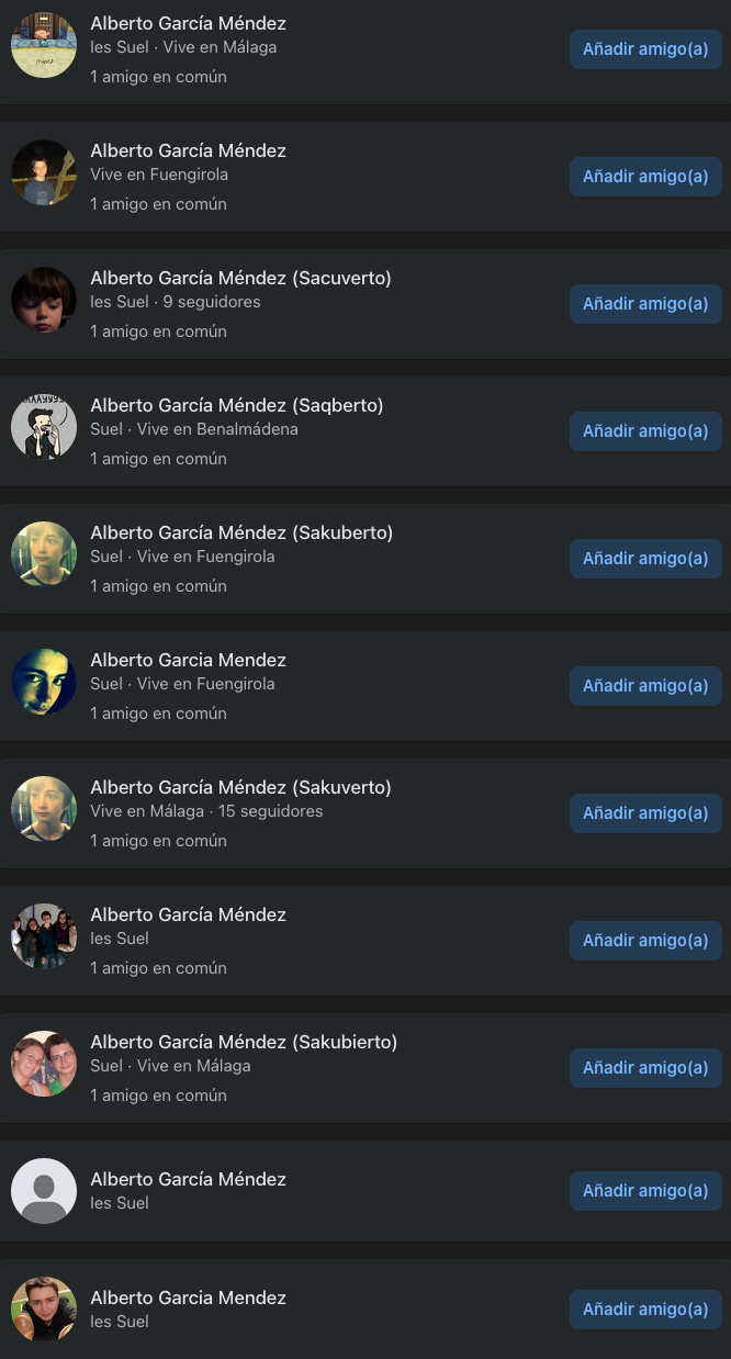 Pensaba que mi problema de mi fracaso social podía arreglarse con solo crear una cuenta impecable en Tuenti, mediante publicaciones graciosas o un nombre guay. Al ver que no lo conseguía, tal vez creí que con solo crearme una nueva cuenta (con todo el trabajo que esto conllevaba, como agregar de nuevo a todo el mundo y reconfigurar mi perfil), podía de pronto dar con la tecla, nunca mejor dicho, y convertirme en algo popular en redes. ¿Es raro lo que os cuento? Mirad la siguiente captura: 11 cuentas distintas de Facebook, inaccesibles por no recordar su contraseña, y que solo se diferenciaban por un nombre de URL o pseudónimo distinto: sakuberto, saqberto, alberteju, accaur, donabierto (juego de palabras con el que pretendía reapropiarme del insulto “culoabierto”, al más puro estilo Putochinomaricón), variaciones de los apellidos… Una auténtica locura.