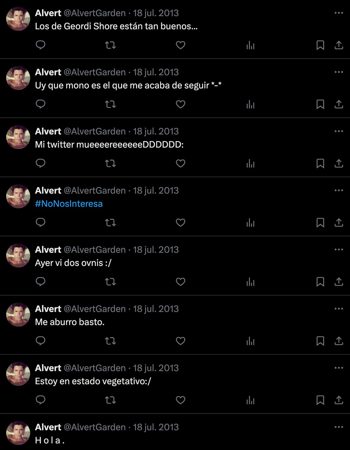 En esos perfiles antiguos puedo encontrar incluso ligues digitales, en interacciones con otros usuarios con los que quise entablar una relación romántica, aunque todo finalmente se quedara en sexting prehistórico. También encontramos los síntomas de lo que más tarde sería la duplicación de la realidad en las redes sociales: notificábamos al mundo de haber pasado la tarde con una amiga tuideando algo como “Diita suuuUper GuaYY con SilviA, La mejor te AMO<3”, como si a alguien tuviera que importarle.