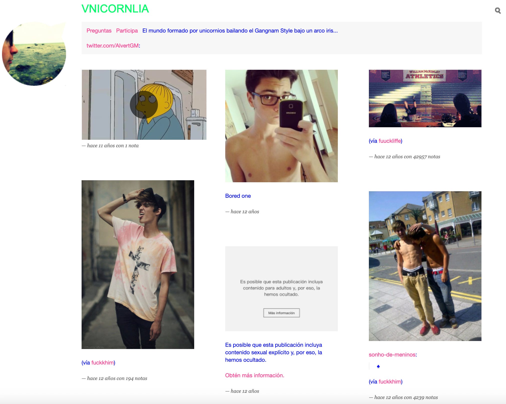 Yo quería tener presencia en todos lados, aunque al final nunca compartiese apenas contenido propio. En realidad fue en Tumblr donde más prolífico fui, porque no tenía que crear yo nada, sino tan solo repostear aquel chorro potente y abundante de estética de teen depresivo, que escuchaba a Miley Cyrus y a Marina and the Diamonds, y que encontraba en el posteriormente denostado contenido erótico (y directamente pornográfico) de Tumblr las primeras referencias a su sexualidad.