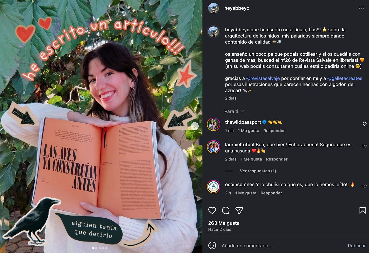 A lo largo de los años he probado diferentes trabajos como en una agencia de publicidad, pero desde principios de año soy autónoma y por suerte están saliéndome oportunidades como educadora ambiental, estoy muy agradecida por ello y muchas veces llegan gracias a las redes sociales. Yo las utilizo con un doble propósito: educar y conseguir oportunidades laborales.